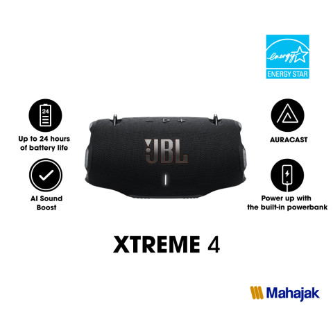 JBL Xtreme 4 ลำโพงบลูทูธพกพารุ่นพรีเมียมที่ให้พลังเสียงกระหึ่ม เบสแน่น ฟังสนุกได้ทุกแนวเพลง เหมาะทั้งปาร์ตี้ริมสระ ทริปแคมป์ปิ้ง หรือใช้งานในบ้าน ด้วยดีไซน์แข็งแรงพกพาสะดวก พร้อมคุณสมบัติกันน้ำและแบตเตอรี่ที่ใช้งานได้ยาวนานสูงสุด 24 ชั่วโมง ให้คุณเปิดเพลงต่อเนื่องได้ตลอดวันแบบไม่สะดุด