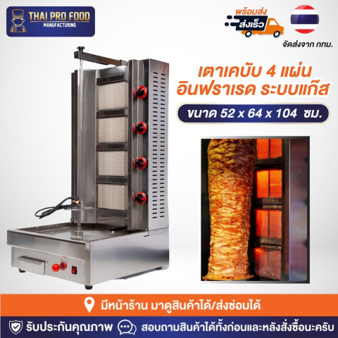 เตาเคบับ 4 แผ่น อินฟราเรด ระบบแก๊ส (ขนาดใหญ่ที่สุด) ตัวช่วยทำเคบับ/ชาวาร์มาให้สุกฉ่ำสม่ำเสมอแบบมืออาชีพ เหมาะทั้งร้านอาหาร รถเข็น และครัวเชิงพาณิชย์ ให้ความร้อนดี กระจายไฟทั่วถึง พร้อมระบบแกนหมุนอัตโนมัติ 360° เพียงเสียบปลั๊กไฟบ้านแล้วกดสวิตช์ เนื้อหมุนเองไม่ต้องเฝ้า ลดโอกาสไหม้และช่วยให้สีสวยน่าทาน