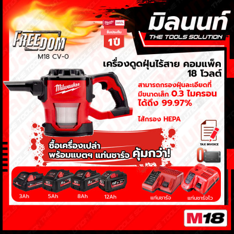 Milwaukee M18CV-0 เครื่องดูดฝุ่นคอมแพ็คไร้สาย (พร้อมแบตเตอรี่ 8Ah และแท่นชาร์จ) ทางเลือกสำหรับงานทำความสะอาดหน้างานและพื้นที่ใช้งานที่ต้องการความคล่องตัว ให้แรงดูดทรงพลัง เก็บเศษฝุ่นไม้ เศษเหล็ก และฝุ่นทั่วไปได้อย่างมีประสิทธิภาพ มาพร้อมไส้กรอง HEPA ช่วยดักจับฝุ่นละเอียด เหมาะทั้งงานช่าง งานติดตั้ง และงานดูแลพื้นที่ภายในบ้าน