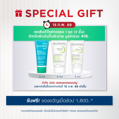 [GIFT] BIODERMA ชุดของขวัญมูลค่า 416.- เซ็ตของสมนาคุณสำหรับสายดูแลผิว ที่คัดสรรไอเท็มกลุ่ม Sébium เพื่อช่วยดูแลผิวมันและผิวที่มีแนวโน้มเป็นสิวง่าย เหมาะสำหรับพกพา ทดลองใช้ หรือเป็นของแถมคู่กับการช้อปผลิตภัณฑ์ Bioderma ชิ้นโปรด