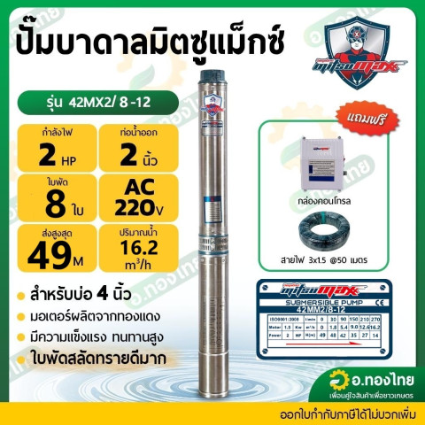 (มีกล่องคอนโทรล) ปั๊มบาดาล ซัมเมอร์ส MITSUMAX รุ่น 42MX2/8-12 ขนาด 2 นิ้ว 2 แรงม้า 8 ใบพัด เหมาะสำหรับงานสูบน้ำบาดาล/สูบน้ำขึ้นแทงก์ งานเกษตร รดน้ำสวน หรือใช้งานภายในบ้าน ให้แรงส่งดี ปริมาณน้ำสม่ำเสมอ พร้อมกล่องควบคุมติดตั้งใช้งานได้สะดวก และแถมสายไฟ 50 เมตร คุ้มค่า พร้อมลงบ่อได้ตั้งแต่ 4 นิ้วขึ้นไป