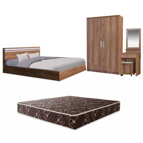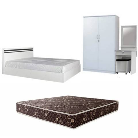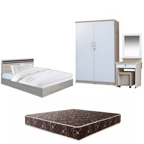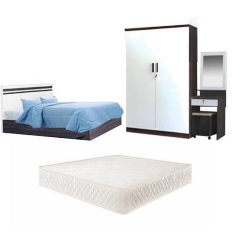 ชุดห้องนอน เตียง 6 ฟุต (พร้อมที่นอนมีประกัน) + ตู้เสื้อผ้า + โต๊ะเครื่องแป้ง ในราคา 10,971.00 บาท ครบชุดพร้อมจัดวางให้ห้องนอนดูเป็นสัดส่วน ใช้งานได้จริง ทั้งพื้นที่พักผ่อน พื้นที่เก็บของ และมุมแต่งตัวในเซ็ตเดียว โทนสี AS/WH พร้อม ที่นอนสีครีม ช่วยให้ห้องดูสว่าง สะอาดตา และเข้ากับการแต่งห้องได้หลายสไตล์