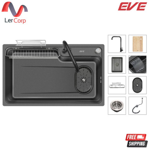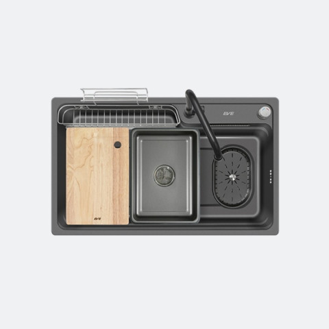 (Eve) ซิงค์ล้างจานสแตนเลส 1 หลุม NAVI 750/480 พร้อมอุปกรณ์อเนกประสงค์ ราคา 8,990.00 บาท ยกระดับครัวให้ดูหรู เท่ และใช้งานได้จริงด้วยซิงค์สีดำจากกระบวนการ PVD ที่ให้สีติดทนโดยไม่ต้องพ่นสี พร้อมผิวสัมผัสแบบ Volcanic Emboss มิติคล้ายหินภูเขาไฟ ช่วยลดรอยนิ้วมือ ลดรอยขีดข่วน ทำความสะอาดง่าย และช่วยให้น้ำไหลผ่านได้ดี ลดการสะสมของคราบสกปรก เหมาะสำหรับครัวที่ใช้งานหนักทุกวัน
