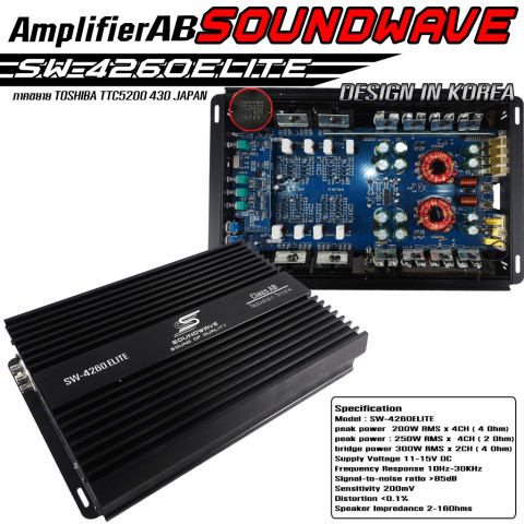 POWER Class AB 4Ch รุ่น SW-4260ELITE (SOUNDWAVE) เพาเวอร์แอมป์รถยนต์คลาสเอบีเกรดพรีเมียม ออกแบบภายใต้คอนเซ็ปต์ Design in Germany ให้พลังขับเต็มกำลัง รายละเอียดเสียงชัดเจน เสียงสะอาดสดใส ปลายแหลมพริ้ว กลางคมชัด เหมาะทั้งชุดฟังสบายและชุดเน้นพลัง เปิดอัดต่อเนื่องได้นานด้วยงานประกอบคุณภาพและการระบายความร้อนที่ดี