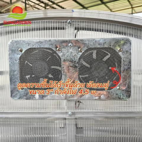 หลังคาใช้แผ่นโพลีคาร์บอเนตใสเคลือบสารป้องกันรังสี UV ให้แสงอาทิตย์ส่องผ่านได้ดี แต่กักเก็บความร้อนภายใน ทำให้อุณหภูมิภายในเหมาะต่อการอบแห้งระบายอากาศอย่างมีประสิทธิภาพ