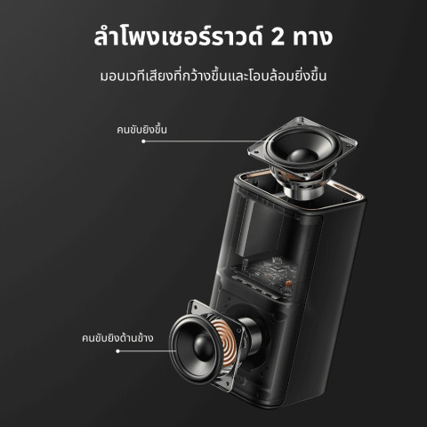 ลำโพงรอบทิศทางด้านหลังออกแบบให้กระจายเสียงหลายทิศทาง ด้วยไดรเวอร์ยิงด้านข้าง + ยิงขึ้น ช่วยสร้างเวทีเสียงที่กว้าง สมจริง และมีมิติลึกเบสอัลตร้าไลน์ ลงได้ลึกถึง 20Hz