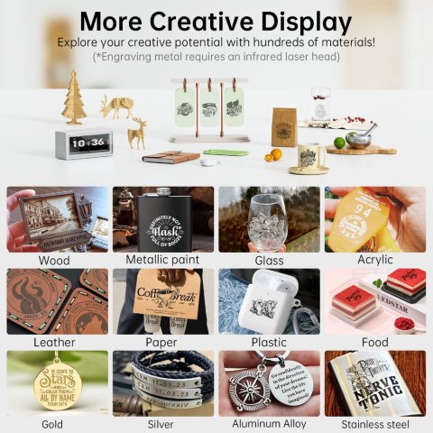 ความสามารถในการแกะสลัก/ตัดขึ้นอยู่กับชนิดวัสดุ สี ความหนา และการตั้งค่า (กำลัง/ความเร็ว/จำนวนรอบ) แนะนำทดสอบบนเศษวัสดุก่อนทำงานจริง