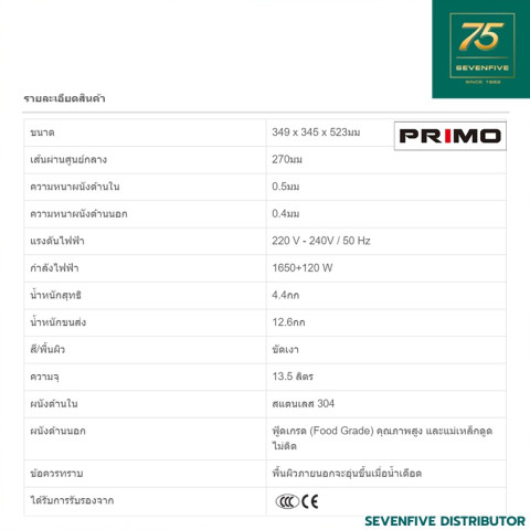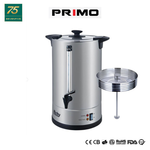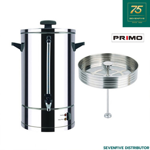 PRIMO หม้อต้มกาแฟจัดเลี้ยง/โรงแรม รุ่น PIM1-ECM-13 ความจุ 13.2–13.5 ลิตร (ประมาณ 90 คัพ ที่ 150 มล./คัพ) พร้อมชั้นกรองกากกาแฟในตัว เหมาะสำหรับงานบุฟเฟต์ โรงแรม ห้องประชุม คาเฟ่ หรือออฟฟิศที่ต้องการเสิร์ฟกาแฟ/น้ำร้อนปริมาณมากอย่างต่อเนื่อง ตัวเครื่องผนังสองชั้นช่วยรักษาอุณหภูมิได้ดี ใช้งานปลอดภัยด้วยระบบป้องกันความร้อนสูงเกิน 2 ชั้น และก๊อกจ่ายแบบหลายทิศทางใช้งานสะดวกในทุกมุมเสิร์ฟ