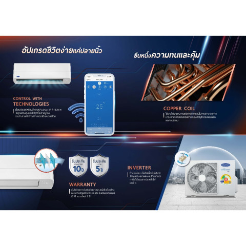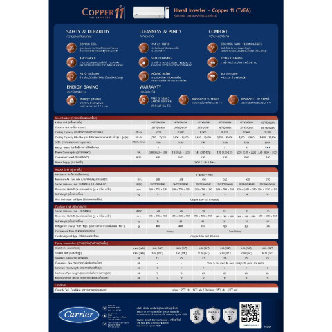 เย็นไว ประหยัดไฟ และดูแลอากาศในบ้านได้ครบในเครื่องเดียวด้วย CARRIER Copper 11 (TVEA) แอร์อินเวอร์เตอร์มาตรฐาน ฉลากประหยัดไฟเบอร์ 5 พร้อม WiFi ในตัว ควบคุมผ่านมือถือได้สะดวก มาพร้อม คอยล์ทองแดง (Copper Coil) ทนทาน ใช้งานมั่นใจ เหมาะสำหรับบ้าน คอนโด และออฟฟิศที่ต้องการความเย็นสบายต่อเนื่อง