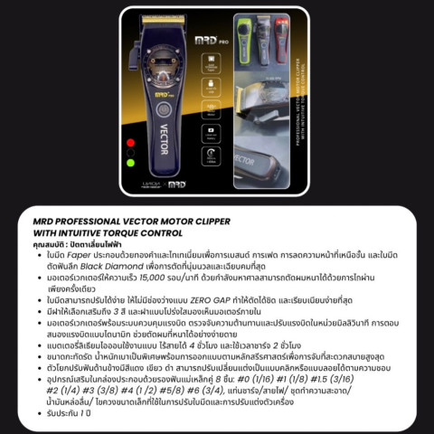 ปัตเลี่ยนไร้สาย MRD PROFESSIONAL Vector Motor Clipper พลังตัดระดับมืออาชีพสำหรับงานไถเก็บ งานเบลนด์ งานเฟด และลดความหนาได้อย่างเนียนกริบ ด้วยมอเตอร์เวกเตอร์ความเร็วสูง 11,500 - 15,000 รอบ/นาที พร้อมระบบ Intuitive Torque Control ตรวจจับแรงต้านและปรับแรงบิดแบบเรียลไทม์ในระดับมิลลิวินาที ตัดผมหนาได้ลื่นไหลแม้ไถผ่านเพียงครั้งเดียว