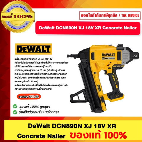 DEWALT DCN890N XJ 18V XR Concrete Nailer ของแท้ 100% ราคา 24,900.00 บาท ปืนยิงตะปูคอนกรีตไร้สายระบบแบตเตอรี่ 18V XR ที่ออกแบบมาเพื่อความเร็ว ความแม่นยำ และพลังในการยิงตะปูเข้าคอนกรีต/เหล็ก/โครงงานติดตั้งรางยิปซัมได้อย่างมีประสิทธิภาพ พร้อมมอเตอร์ Brushless ช่วยเพิ่มระยะเวลาการใช้งานและแรงขับสำหรับตะปูที่ยาวขึ้น ใช้งานแบบ ไม่ต้องใช้แก๊ส ลดต้นทุนต่อช็อต ทำงานสม่ำเสมอแม้ในอุณหภูมิสุดขั้ว และดูแลรักษาง่าย