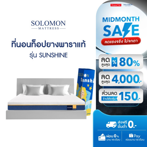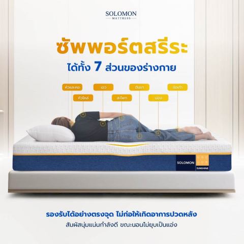 SOLOMON ที่นอนยางพารา รุ่น Sunshine (หนา 8 นิ้ว) ที่นอนที่ออกแบบมาเพื่อ “ลดแรงกดทับ-ซัพพอร์ตสรีระครบ 7 ส่วน” ช่วยจัดแนวกระดูกสันหลังให้เหมาะสมตามหลักสรีรศาสตร์ บอกลาอาการปวดหลังและปวดเมื่อยหลังตื่นนอน ให้คุณหลับลึก สบายตัวตลอดคืน พร้อมเทคโนโลยีระบายความร้อนและลดกลิ่นไม่พึงประสงค์ เหมาะทั้งคนที่นอนหงาย นอนตะแคง และผู้ที่ต้องการความนุ่มแน่นกำลังดี