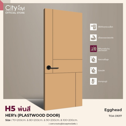 เหมาะสำหรับบ้านที่ต้องการประตูภายในที่สวย เรียบหรู ทนชื้น ทนปลวก และติดตั้งได้ทั้งบานเปิดหรือบานเลื่อน เลือก HER's PLASTWOOD รุ่น H5 เพื่อความคุ้มค่าและความสบายใจในทุกการใช้งาน