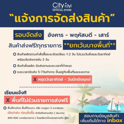 พื้นที่ห่างไกล/ข้ามเกาะ/บนดอย/พื้นที่เข้าถึงยาก อาจมีค่าส่งคิดตามจริง (โดยประมาณ 300-500 บาท/รายการ) แนะนำสอบถามก่อนสั่งซื้อ
