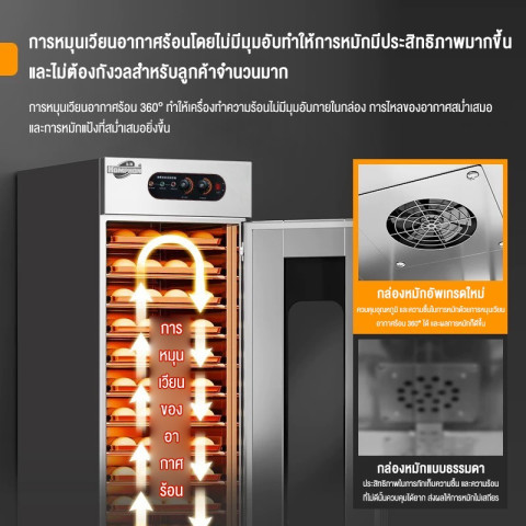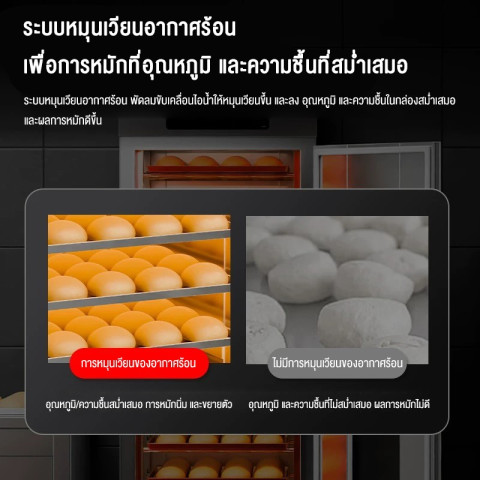 หมักขึ้นไว สม่ำเสมอ ด้วยระบบลมร้อนแบบหมุนเวียน ช่วยกระจายความร้อนทั่วตู้ ทำให้แป้งขึ้นฟูเท่ากันทุกชั้น