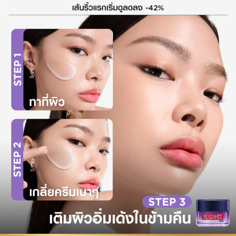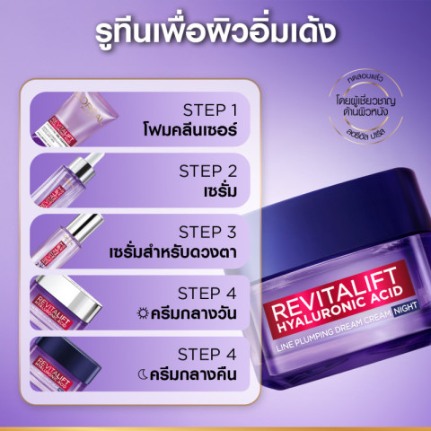 ลอรีอัล ปารีส L'Oréal Paris Revitalift Hyaluronic Acid Line Plumping Night Cream ไนท์ครีม 50 มล. มอบการบำรุงยามค่ำคืนเพื่อผิวดูอิ่มฟู ฉ่ำเด้ง และเรียบเนียนขึ้น ด้วยสูตรที่ได้แรงบันดาลใจจากหัตถการด้านความงาม พร้อมเทคโนโลยี Long-Lasting Hyaluronic AcidCX ช่วยเติมและล็อคความชุ่มชื้นให้ผิวอย่างมีประสิทธิภาพ ตื่นมาพร้อมผิวที่ดูสดใส กระชับ และยืดหยุ่นขึ้น