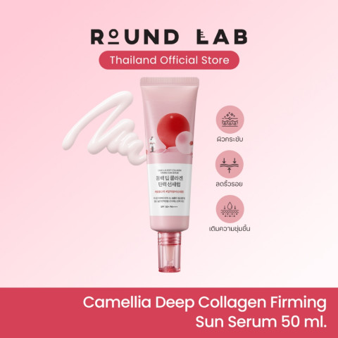 Round Lab Camellia Deep Collagen Firming Sun Serum SPF 50+ PA++++ (50 ml) ครีมกันแดดเนื้อเซรั่มสีชมพูที่มอบการปกป้องผิวขั้นสุด พร้อมบำรุงให้ผิวดูอิ่มฟู กระชับ และเรียบเนียนในขั้นตอนเดียว เนื้อสัมผัสบางเบา เกลี่ยง่าย สบายผิว ไม่เหนียวเหนอะหนะ และไม่รบกวนเมคอัพ เหมาะสำหรับใช้ทุกวันเพื่อผิวสวยดูสุขภาพดีตลอดวัน