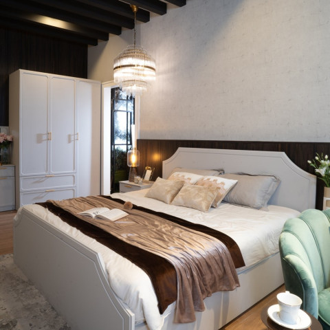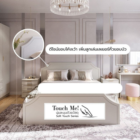 ลูกเล่น คิ้วขอบบัวแบบเลเยอร์ และ ขอบโค้งเว้าสไตล์วินเทจ ทั้งหัวเตียงและท้ายเตียง เพิ่มมิติให้ห้องนอนดูแพงขึ้นทันที