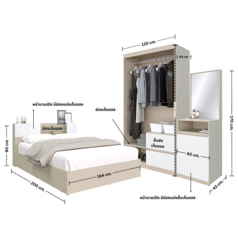 รายการในชุด: เตียง 5 ฟุต + ตู้เสื้อผ้า 120 ซม. + โต๊ะเครื่องแป้ง 60 ซม.