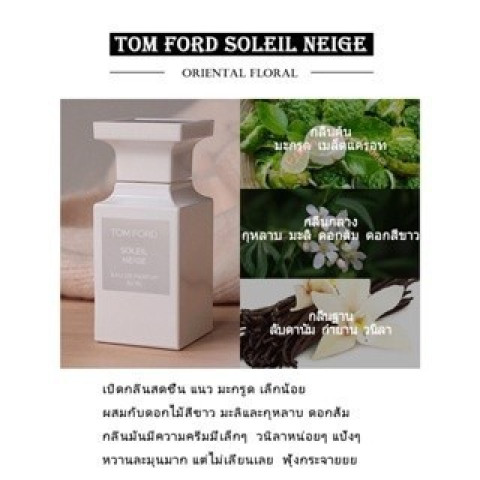 ♦️100%ของแท้·พร้อมส่ง♦️ TOM FORD TF Soleil Neige Eau de Parfum (EDP) Spray 100ml น้ำหอมยูนิเซ็กส์กลิ่นหรูแบบ Floral Oriental ที่ให้ความรู้สึกสะอาด นุ่มละมุน และมีมิติความหวานอุ่นจากวานิลลา เหมาะทั้งผู้หญิงและผู้ชาย ใช้ได้ทุกโอกาส โดยเฉพาะวันที่อยากได้ลุคเรียบหรูแต่โดดเด่น