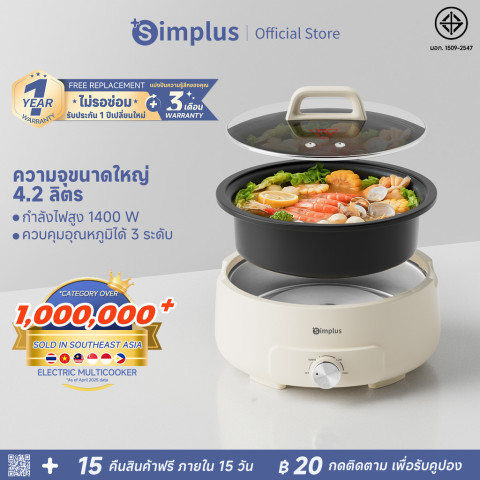 Simplus หม้อต้มไฟฟ้า 4.2L 1400W รุ่น DHGH002 (สีขาวครีม) หม้ออเนกประสงค์สำหรับครัวเรือนที่ทำได้ครบทั้งต้ม ตุ๋น สตูว์ เคี่ยว และชาบูในหม้อเดียว ด้วยความจุใหญ่ 4.2 ลิตร เส้นผ่านศูนย์กลาง 31 ซม. ตุ๋นไก่ทั้งตัวได้สบาย ซุปเดือดไม่กระเด็น ช่วยให้ทำอาหารได้สะดวก อร่อยไว ไม่ต้องรอนาน ในราคา 854.55 บาท