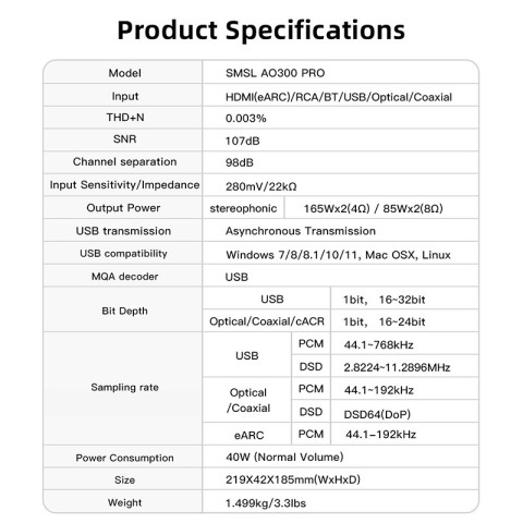 SMSL AO300 Pro 3 in 1 เครื่องเดียวจบสำหรับคนรักเสียงเพลง—ทั้ง ถอดรหัส DAC, แอมป์หูฟัง และ แอมป์ขับลำโพง รองรับเสียงความละเอียดสูง PCM 32Bit/768kHz และ DSD256 พร้อม Bluetooth 5.3 ใช้งานสะดวก และมี รีโมทคอนโทรล ให้ควบคุมได้จากระยะไกล ตัวเครื่องอลูมิเนียมสีเงินงานพรีเมียม แข็งแรง เข้ากับทุกเซ็ตอัปบนโต๊ะทำงานหรือห้องฟังเพลง