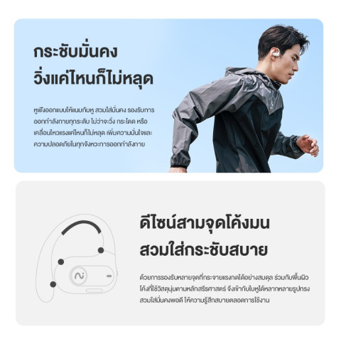 โครงสร้างแบบ Open Ear ไม่กดทับ ไม่ร้อน ไม่อับ ช่วยให้ได้ยินเสียงรอบข้างอย่างเป็นธรรมชาติ เพิ่มความปลอดภัยขณะเดินทางหรือออกกำลังกายกระชับมั่นใจ ไม่หลุดง่าย