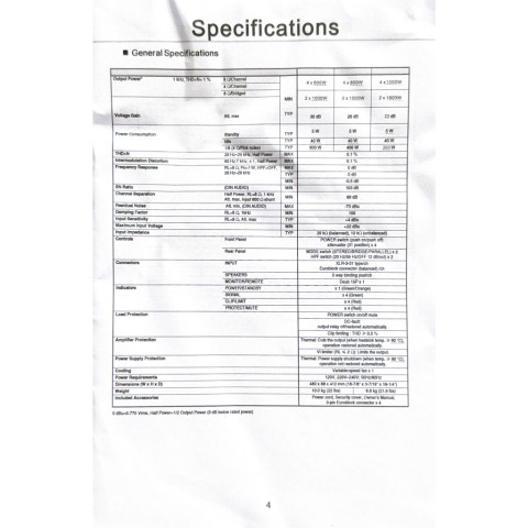 4 แชนแนล กำลังขับสูงสุดประมาณ 4x1000W (ขึ้นอยู่กับโหลดและค่าความต้านทานของลำโพง)ประเภทแอมป์