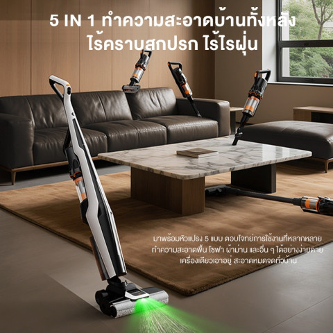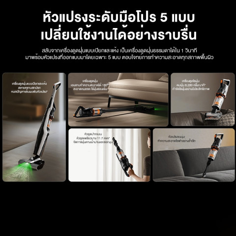 มาพร้อมหัวแปรง/อุปกรณ์ 5 แบบ ปรับโหมดการใช้งานได้ตามสถานการณ์ ไม่ว่าจะเป็นเครื่องล้างพื้น, เครื่องดูดฝุ่นไร้สาย, เครื่องกำจัดไรฝุ่น, เครื่องดูดฝุ่นแบบมือถือ และเครื่องดูดฝุ่นในรถยนต์พ่นน้ำแรงดันสูงเฉพาะจุด (สูงสุด 100 เท่า*)