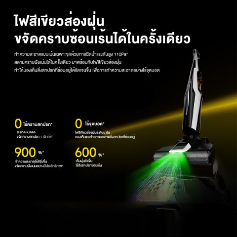 เพิ่มพลังจัดการคราบหนักด้วยการพ่นน้ำแบบเน้นจุด ปริมาณน้ำมากขึ้น (10 เท่า) ช่วยยกคราบได้ไว ทำความสะอาดทรงพลังขึ้น (สูงสุด 9 เท่า)ไฟสีเขียวส่องฝุ่น เห็นชัดขึ้น 6 เท่า*