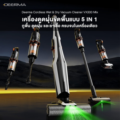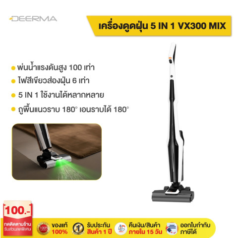 Deerma VX300 Mix Cordless Wet & Dry Vacuum Cleaner 22Kpa 300W (5 in 1 Combo) เครื่องล้างพื้นและเครื่องดูดฝุ่นไร้สายตัวจบสำหรับบ้านยุคใหม่ ดูด-ถู-ล้าง-ฆ่าเชื้อ-อบแห้ง ครบในเครื่องเดียว พร้อมแรงดูดสูง ≥22Kpa และกำลังไฟ 300W ช่วยจัดการทั้งฝุ่น เศษผง คราบเปียก และคราบฝังแน่นได้รวดเร็ว ประหยัดเวลา เหมาะทั้งพื้นแข็งและพื้นที่ต้องการความสะอาดเป็นพิเศษ