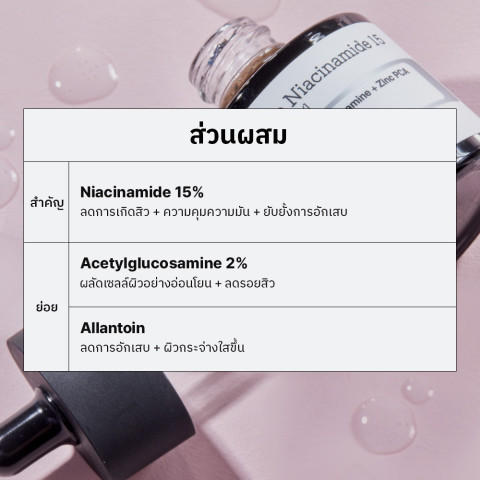 Niacinamide 15% – ช่วยลดการอักเสบของสิว ควบคุมความมันส่วนเกิน เสริมเกราะป้องกันผิว และช่วยลดเลือนจุดด่างดำ