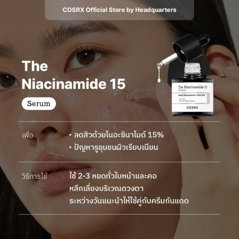 [COSRX OFFICIAL] The Niacinamide 15 Serum 20ml เดอะ ไนอะซินาไมด์ 15 เซรั่มเข้มข้นจัดการปัญหาสิวอย่างตรงจุด ด้วยพลัง Niacinamide 15% ผสาน Acetyl Glucosamine และ Zinc PCA ดูแลผิวเป็นสิวง่ายแบบครบวงจร ตั้งแต่ขั้นตอนลดการอักเสบ ฟื้นฟูรอยสิว ไปจนถึงช่วยให้ผิวกลับมาเรียบเนียน กระจ่างใสอย่างเป็นธรรมชาติ พร้อมผ่านการจดทะเบียนกับ อย. (FDA Registration No. 10-2-6600009242) มั่นใจในความปลอดภัยและอ่อนโยนต่อผิว