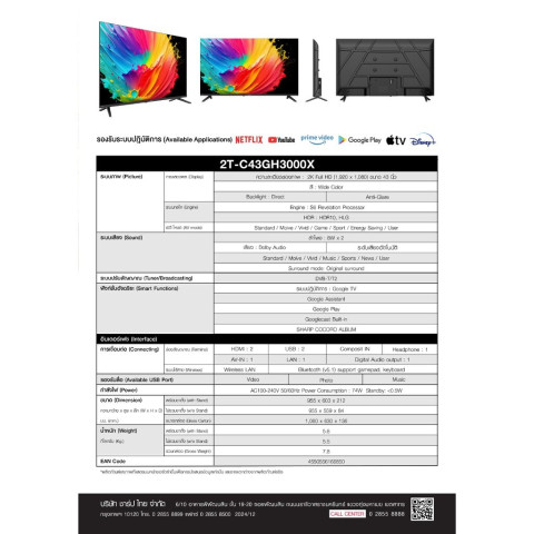 SHARP Google TV 43 นิ้ว รุ่น 2T-C43GH3000X สมาร์ททีวีที่ตอบโจทย์ความบันเทิงครบเครื่องในบ้าน ให้ภาพคมชัดด้วยจอ LED Backlight ความละเอียดระดับ WXGA (1,366 x 768) พร้อมเทคโนโลยี Wide Colour เพื่อสีสันสมจริงใกล้เคียงธรรมชาติ และรองรับ HDR10/HLG ช่วยเพิ่มมิติแสงเงา ดูหนัง ซีรีส์ และคอนเทนต์โปรดได้เต็มอารมณ์บนจอ 43 นิ้ว