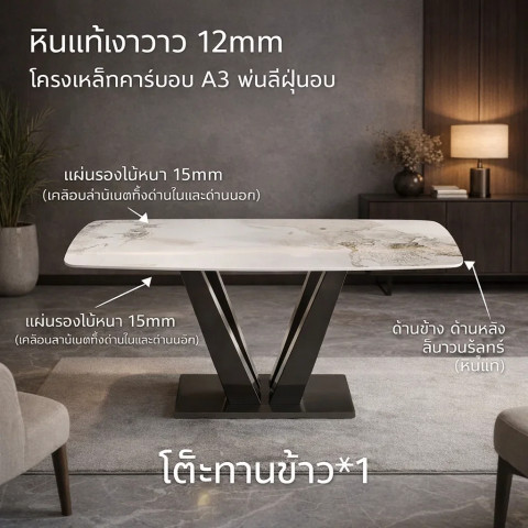 วัสดุท็อปโต๊ะ: แผ่นหินชนวน (Slate) ลายหินอ่อน หนา 12 มม.