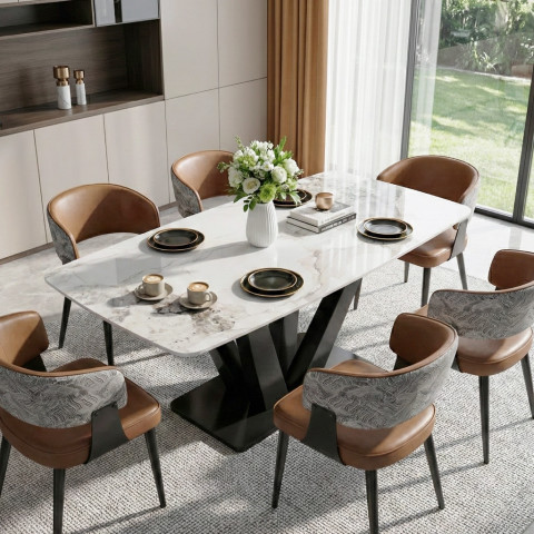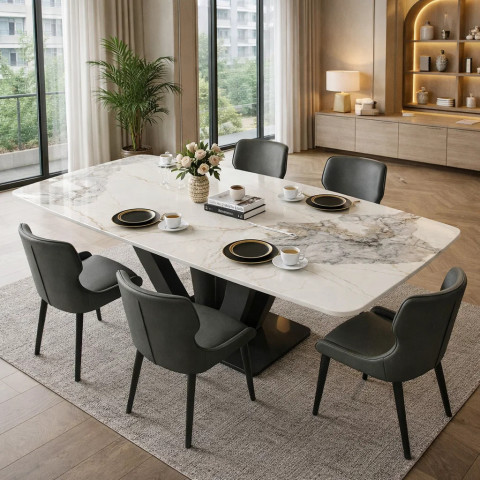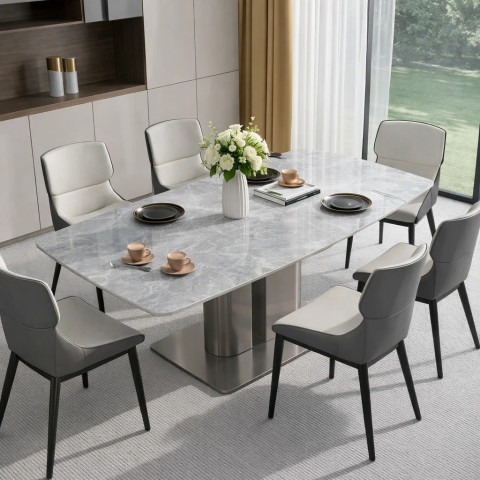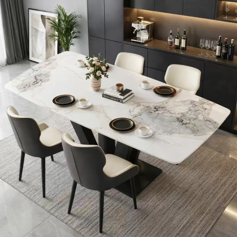 หน้าโต๊ะหินชนวน (Slate) ลายหินอ่อนแท้หนา 12 มม. ผสานกับขาโต๊ะเหล็กและสแตนเลสดีไซน์เรียบหรู สียอดนิยมดำทอง/ดำ–ขาว ช่วยเติมบรรยากาศทันสมัยให้ทุกมื้ออาหาร ดูแพงแบบมินิมอลในสไตล์โมเดิร์นลักซ์