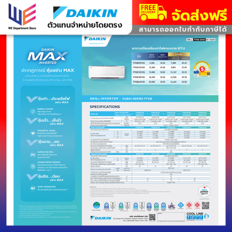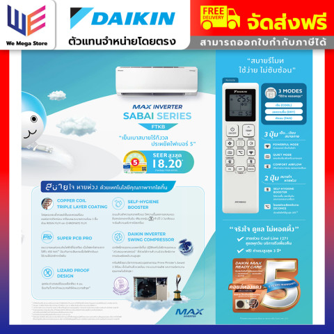 สรุป: หากคุณมองหาแอร์อินเวอร์เตอร์ที่ทั้งเย็นเร็ว เงียบ ประหยัดไฟ ทนทาน มีฟังก์ชันดูแลอากาศภายในห้อง และบริการหลังการขายจากศูนย์ Daikin โดยตรง DAIKIN MAX INVERTER SABAI SERIES FTKB-ZV2S คือหนึ่งในตัวเลือกที่คุ้มค่าที่สุดสำหรับบ้านคุณ