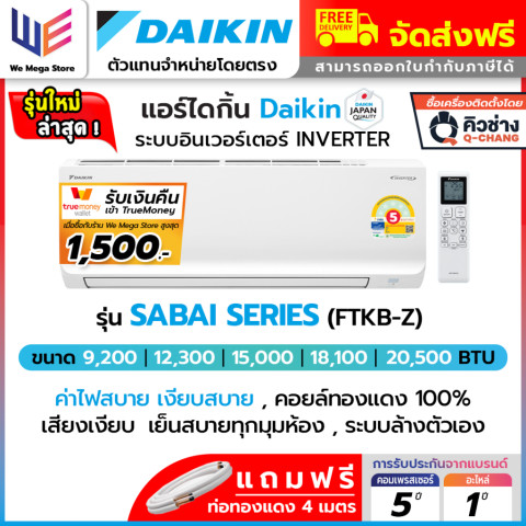 รุ่นอ้างอิงในตัวอย่างสเปค เช่น ⭐ 12,300 BTU (FTKQ12Y), ผ่อน/Spay+ติดตั้ง เป็นตัวเลือกขนาด BTU และรูปแบบการจ่ายเงิน ลูกค้าควรตรวจสอบให้ตรงกับขนาด BTU และตัวเลือก “พร้อมติดตั้ง” หรือ “เฉพาะเครื่อง” ก่อนกดสั่งซื้อทุกครั้ง