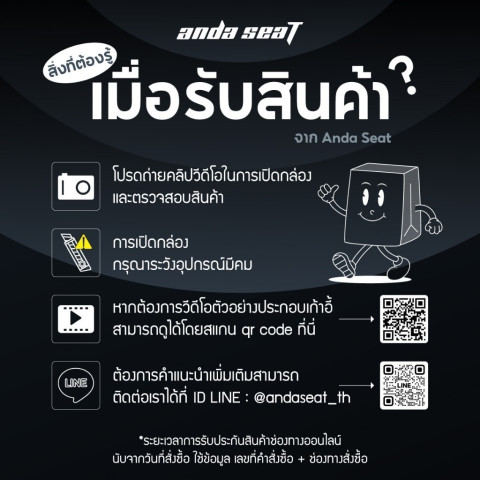 เมื่อได้รับพัสดุ กรุณาถ่ายวิดีโอ ตั้งแต่เริ่มเปิดกล่องจนตรวจสอบสินค้าให้ชัดเจน (ห้ามตัดต่อ) เพื่อใช้เป็นหลักฐานในการ เคลม/เปลี่ยน/คืน กรณีชำรุด เสียหาย ได้สินค้าไม่ครบ หรือร้านค้าส่งผิดรุ่น