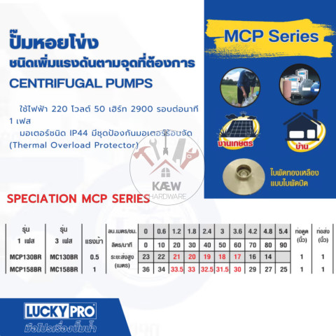 LUCKY PRO รุ่น LP-MCP158BR คือทางเลือกที่ลงตัวสำหรับงานส่งน้ำที่ต้องการทั้งความแรง ความเสถียร และความทนทาน ใช้งานได้มั่นใจด้วยการรับประกันและบริการหลังการขาย พร้อมให้คุณติดตั้งและใช้งานได้ทันทีเมื่อได้รับสินค้า