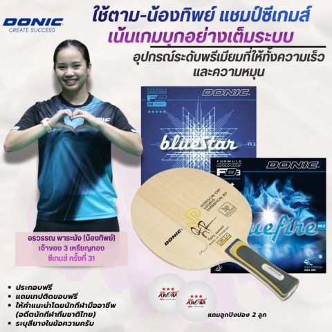 สัมผัสประสบการณ์เกมรุกระดับโปรด้วย [ ชุดที่น้องทิพย์ใช้จริง ] ไม้ปิงปองประกอบ DONIC PERSSON OFF+ WORLD CHAMPION 89 + BLUESTAR A1 + BLUEFIRE M2 ชุดไม้ปิงปองประกอบสุดพรีเมียมที่ออกแบบมาเพื่อผู้เล่นสไตล์บุกโดยเฉพาะ ผสมผสานความเร็วจัดจ้าน พลังสปินสูง และฟีลลิ่งการตีลูกที่เฉียบคม ให้คุณเล่นเกมรุกได้อย่างมั่นใจในทุกจังหวะ