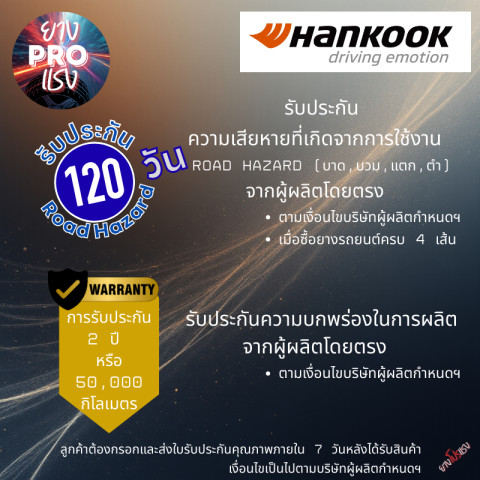รับประกันความเสียหายจากการใช้งานจริง (Road Hazard เช่น บาด บวม แตก ตำ) ตามเงื่อนไขบริษัทผู้ผลิต
