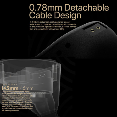 Dual Planar Hybrid Driver ผสานไดรเวอร์แบบ Planar 2 ขนาด เพื่อถ่ายทอดรายละเอียดครบย่าน ตั้งแต่เบสที่เป็นทรงจนถึงปลายแหลมที่ใส