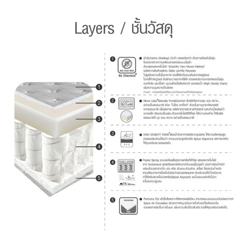 เสริมชั้นวัสดุด้วย HIGH DENSITY FOAM ฟองน้ำวิทยาศาสตร์ที่ยืดหยุ่นสูง ช่วยโอบรับส่วนโค้งเว้าตามแนวกระดูกสันหลัง ลดอาการปวดเมื่อยเมื่อตื่นนอน พร้อมเพิ่มความสบายด้วย MICRO LATEX (ยางพาราอัดผสมฟองน้ำอัดแน่น) ให้สัมผัสนุ่มแน่นอย่างเป็นธรรมชาติ ไม่ยวบง่าย และช่วยเสริมการรองรับให้สมดุลตลอดคืน