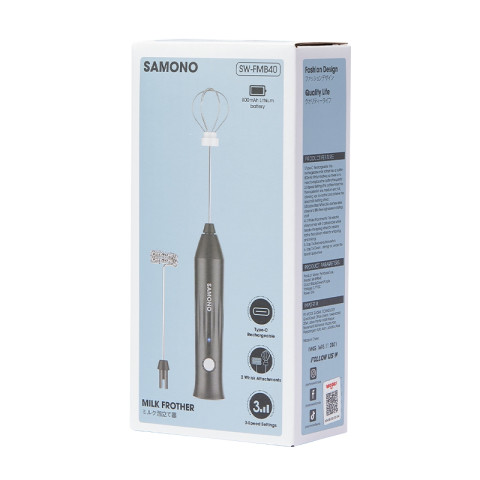 (ประกันศูนย์ 1 ปี) SAMONO เครื่องตีฟองนมไร้สายขนาดเล็ก รุ่น SW-MFB40 ไอเท็มคู่ครัวสำหรับสายกาแฟและสายเบเกอรี่ พกพาง่ายแต่แรงจริงด้วยมอเตอร์พลังสูง 10,000 รอบ/นาที ตีฟองนมนุ่มละเอียดได้ไวในเพียง 10 วินาที ใช้ได้ทั้งนมร้อนและนมเย็น เติมความละมุนให้ลาเต้ คาปูชิโน่ มัทฉะ หรือโกโก้ได้ทุกที่ทุกเวลา