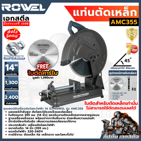 (ส่งไว) ROWEL แท่นตัดเหล็ก AMC355 ใบคาร์ไบด์ 14 นิ้ว ไร้สะเก็ดไฟ ตัดไว ไม่ร้อน ใบทน ประกัน 2+2 ปี เครื่องเดียวที่ช่างเหล็กยุคใหม่ต้องมี ตัดเหล็กได้เร็วกว่าเดิม งานสวย ประหยัดใบตัดและค่าแรงระยะยาว คุ้มค่าทุกการลงทุน