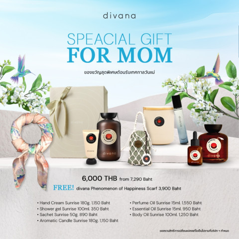 พิเศษยิ่งขึ้นด้วยของแถมสุดเอ็กซ์คลูซีฟ ผ้าพันคอผืนพิเศษลาย “divana Phenomenon of Happiness” มูลค่า 3,900 บาท ที่ตั้งใจมอบให้ฟรี เพื่อเติมเต็มความสุขในทุกวันของแม่