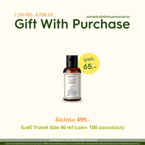[Gift] ของสมนาคุณสุดพิเศษจาก Kaff & Co. สำหรับลูกค้าที่มียอดซื้อครบ 499.- ต่อคำสั่งซื้อ รับฟรีผลิตภัณฑ์ขนาดทดลอง 40 ml (คละสูตร) มูลค่า 65.- เพื่อให้คุณได้ทดลองสัมผัสประสบการณ์การดูแลเส้นผมและหนังศีรษะในแบบฉบับ Kaff & Co. ไปพร้อมกับสินค้าที่คุณเลือกซื้อ