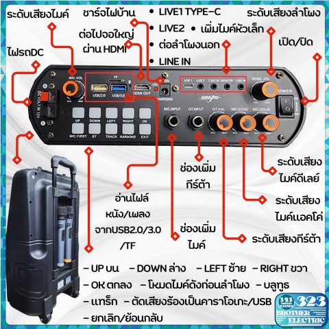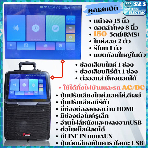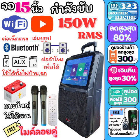 ตู้ลากมีจอ 15 นิ้ว รุ่น 8916 (323BROTHER ELECTRIC) ลำโพงล้อลากพกพาสุดคุ้มสำหรับสายคาราโอเกะและสายปาร์ตี้ ดูยูทูปได้ เชื่อมต่ออินเทอร์เน็ตผ่าน Wi‑Fi ใช้งานง่าย พกพาสะดวก พร้อมพลังเสียงแน่นจากดอกลำโพง 8 นิ้ว กำลังขับ 150W RMS และหน้าจอ ทัชสกรีน 15 นิ้ว ให้ร้อง เล่น และเอ็นเตอร์เทนได้ครบจบในเครื่องเดียว