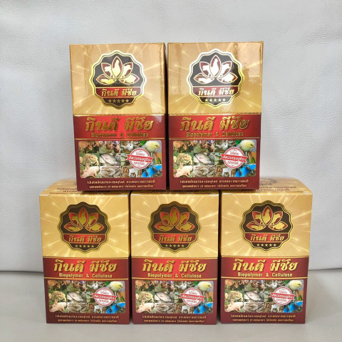 กินดีมีชัย สารเพิ่มประสิทธิภาพอาหารสัตว์ (ไบโอโพลิเมอร์ เซลลูโลส) ขนาดสุดคุ้ม 5 กล่อง (รวม 60 ซอง) ราคา 5,500.00 บาท ตัวช่วยดูแลสุขภาพสัตว์จากภายใน ด้วยสารสกัดจากพืชและสัตว์ที่มีความปลอดภัยสูง ช่วยดูดจับสิ่งปนเปื้อนในอาหารและน้ำ เช่น สารพิษ เชื้อรา แบคทีเรีย และโลหะหนัก ลดโอกาสเกิดโรคจากการกินดื่ม พร้อมช่วยปรับสมดุลระบบย่อยอาหาร เพื่อให้สัตว์แข็งแรง เลี้ยงง่าย และลดการสูญเสียในฟาร์ม